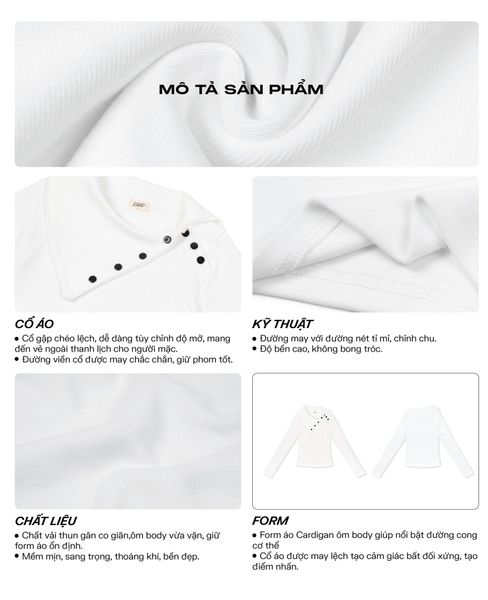 - Form: Cổ gập chéo lệch , tạo cảm giác cổ dài và thanh thoát. Form ôm body dài tay, chiết eo.